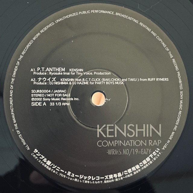 埼玉をレペゼンするRUFF RHYMERSのフロントマン、KENSHINの2002年のソロ・デビュー作「COMPINATION RAP」からのプロモ・サンプラー。クルーのRUFF RHYMERSを引き連れたバウンシーな"ALL MY..."やMUR MURと姫のHARLEM絡みの♀勢を迎えた"ENDLESS"、DJ HAZIMEとDJ NISHIMIYAが連名で手掛けた"ナウイズ"、GROOVEMAN SPOTことDJ KOU-G作でU-ZIPPLAINを迎えたENBULLとガッツリ組んだ"I GOT A 「S」"他、アルバム本編から濃ゆいところを抽出した全5曲収録。プロモのみの見掛けない一枚。 A-1 P.T. ANTHEM A-2 ナウイズ B-1 ENDLESS B-2 ALL MY... B-3 I GOT A 「S」 【フォーマット】12" 【レーベル】SONY 【年代/国名】-/JPN 【盤質/ジャケット】EX/- プロモ盤。やや反り有りですが、プレイには支障ありません。