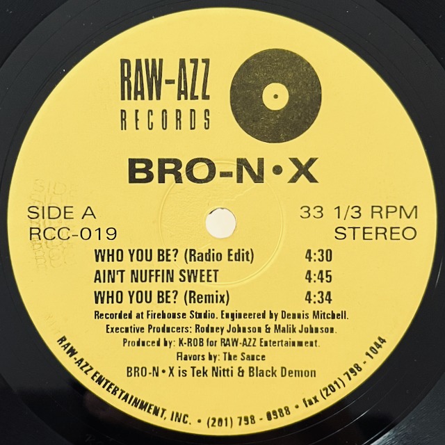 RAMMELLZEEとの"BEAT BOP"で知られるK-ROB絡みのカルト・ニュースクール皿!ONYX辺りを思わせるようなアグレッシブな掛け合いラップがスリリング。オリジナル・バージョンよろしく、定番ブレイクSKULL SNAPS"IT'S A NEW DAY"を使い回して、おどろおどろしさを増したような"WHO YOU BE?"(REMIX)、浮遊感のあるビートでの掛け合いがドープな"AIN'T NUFFIN SWEET"も良し! A-1 WHO YOU BE?(RADIO EDIT) A-2 AIN'T NUFFIN SWEET A-3 WHO YOU BE?(REMIX) B-1 WHO YOU BE?(INSTRUMENTAL) B-2 WHO YOU BE?(REMIX)(INSTR.) B-3 AIN'T NUFFIN SWEET(INSTR.) 【フォーマット】12" 【レーベル】RAW-AZZ RECORDS 【年代/国名】-/US 【盤質/ジャケット】EX-/-