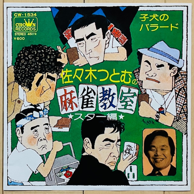 元祖ものまね四天王の一角、故・佐々木 つとむのネタを楽曲化(?)した一枚。妙に黒いファンキーなビートに乗って昭和の名優、高倉 健や渥美 清、さらに田中 角栄や刑事コロンボなどのものまねで麻雀(!)するという珍品!ちなみに、スター編とあるものの、他のレパートリーは音盤化には至っていません。レコード大喜利誌掲載盤。 A-1 佐々木つとむの麻雀教室(スター編) B-1 子犬のバラード 【フォーマット】7" 【レーベル】CROWN RECORDS 【年代/国名】1975/JPN 【盤質/ジャケット】EX/EX