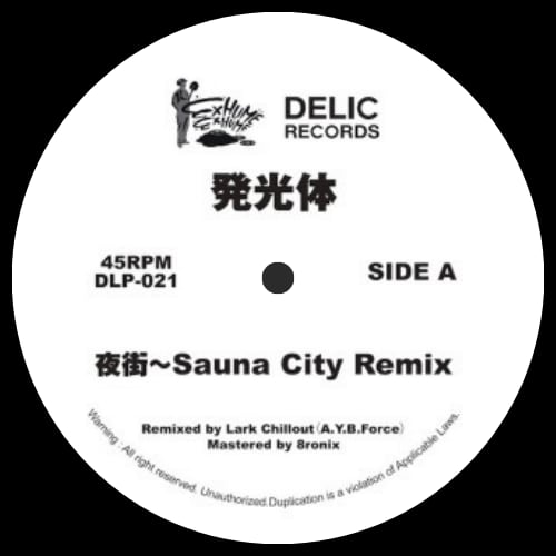 茨城発のジャズ・ロック〜ニュー・フォーク・バンド、発光体のデビューシングル"夜街"をA.Y.B. FORCEのLARK CHILLOUTとMATSUMOTO HISATAAKAAがREMIXした一枚。オリジナルの味わいそのままに、タフなボトムスで90年代の古き良きヒップホップ・ソウル的なバランスに仕上げたLARK CHILLOUTによる"夜街"(SAUNA CITY REMIX)、一転してラヴァーズ・レゲエ風味にダビーに仕上げたMATSUMOTO HISATAAKAA作の"夜街"(ANSWER REMIX)をA/B面に配したダブル・サイダー!美品。