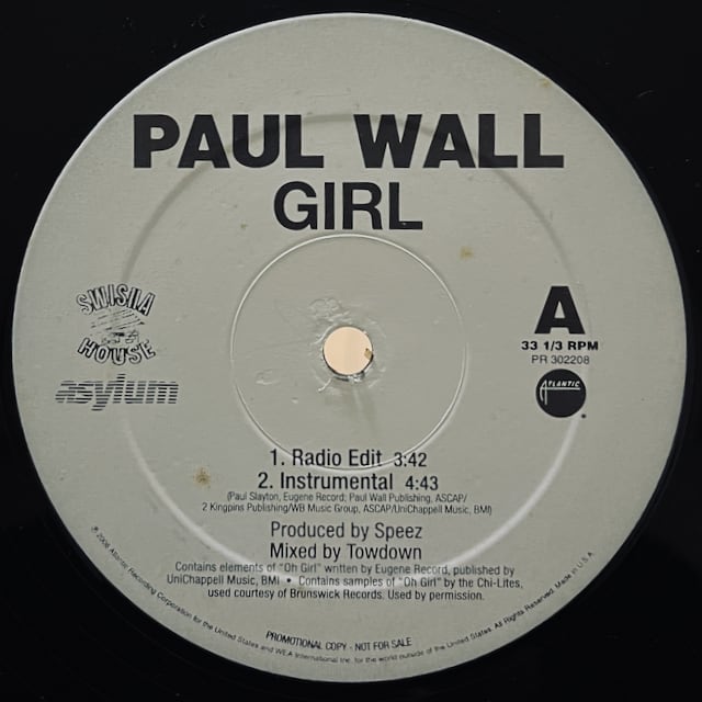SWISHA HOUSEからMIKE JONESに続いてブレイクした白人ソロマイカー、PAUL WALLの2005年の2NDアルバム「THE PEOPLE'S CHAMP」からのプロモオンリー・シングル。CHI-LITESのチーク・タイム定番"OH GIRL"を早回しで使用したビートで、しっぽりと決める人気曲。ソックリな形で再発も出回りましたが、こちらは言うまでもなくオリジナルのUSプロモ。