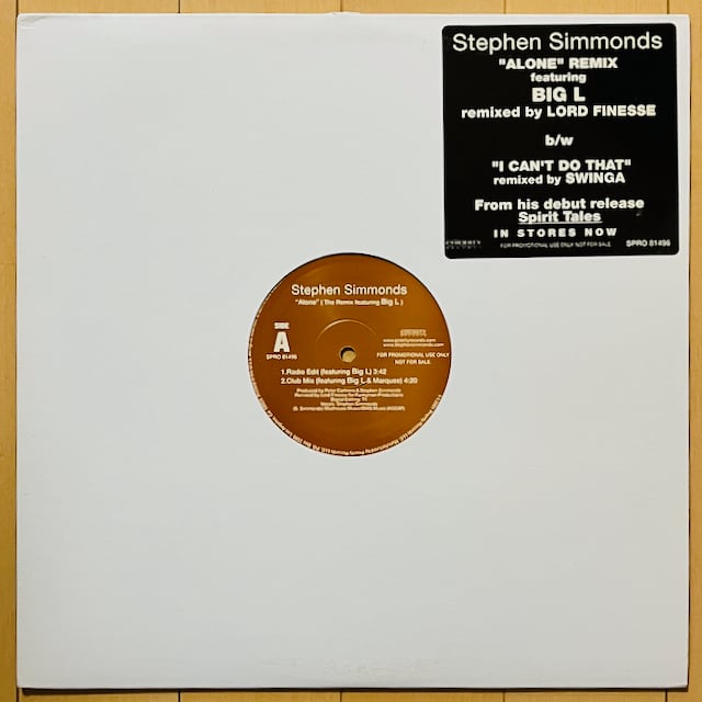 スウェーデンの♂シンガー、STEPHEN SIMMONDSのプロモのみの一枚で、LORD FINESSEが手掛け/BIG Lが客演参加した"ALONE"(REMIX)が、(あくまでD.I.T.C.の系譜の延長線上の評価ながら)人気!R&B仕事はそこまで多くないLORD FINESSEながら、最高峰と言っていいSWV"RIGHT HERE"(FUNKYMAN REMIX)やDR. DRE"THE MESSAGE"辺りにこそ及ばないまでも、JEFF REDD"SHOW YOU"にも追随するナイス・ミディアム。後半の客演、BIG Lヴァースにも注意!ちなみに、SOULSHOCK仕事の裏の"I CAN'T DO THAT"(ATHLETES REMIX)は時流を意識し過ぎた感のある(?)シンコペ・ビート仕様になっています。"ALONE"(THE REMIX)のインストも収録した国内プロモ盤ほどではないにせよ、こちらもあまり見掛けませんでした。再発も存在していますが、こちらは当時のUSプロモ。